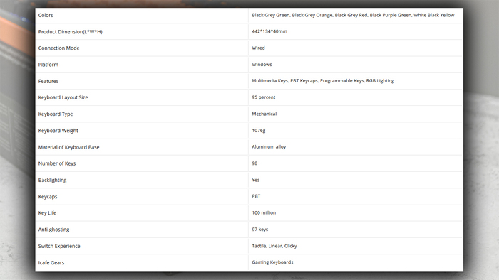 В руках у меня клавиатура Rapoo ESK750-98 в расцветке «Black Gray Orange» или, если по-русски: черно-серо-оранжевая. Всего же цветовых решений у этой модели полдесятка. Цифры 98 в именовании модели говорят об общем количестве клавиш. Остальные спецификации можно увидеть на скриншоте.
