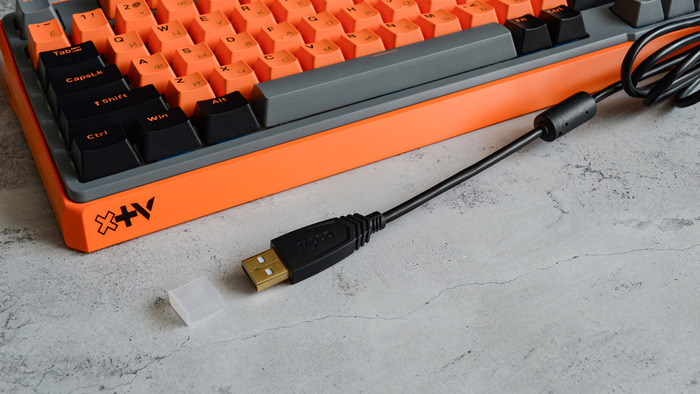 Подключение клавиатуры реализуется двухметровых кабелем USB-A на котором имеется ферритовый фильтр.