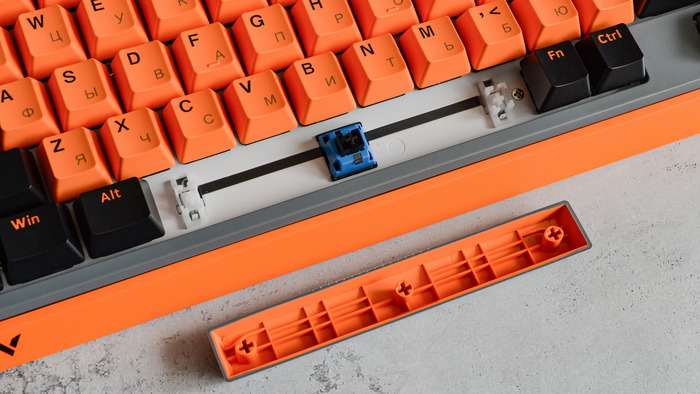 Клавиатура оснащена синими оптическими свитчами, которые можно охарактеризовать как линейные, тактильные, кликающие. Все длинные клавиши оснащены стабилизаторами.