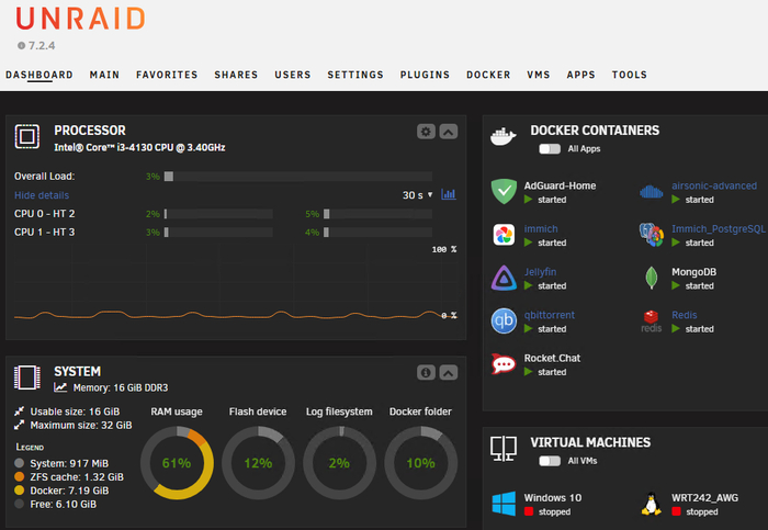 Нужна автономная библиотека всего, что может понадобиться, а её надо где-то хранить. Цены на HDD летят в космос, а с введением утильсбора станут почти недоступными, поэтому я сейчас накупил относительно живых дисков для холодного хранения, а также собрал два ПК на старом железе. Из них я сделал NASы, установив ОС Unraid: один для своих сервисов (его я называю NAS1) стриминга музыки (AirSonic), файловое облако (FileBrowser), галлерея фото (Immich), личного мессенджера (RocketChat), блокировщик рекламы Adguard home и второй для скачивания и хранения всего, что могу использовать в ближайшее время, он скорее выступает перевалочной базой перед перемещением данных в архив. Unraid очень удобен, он умеет собирать массивы без страйпинга, умеет следить за дисками, а если страйпинг не напрягает, то умеет в любую файловую систему (на NAS1 использую ZFS), великолепно работает с Docker и даже как гипервизор (на одном у меня поднята виртуальная машина с openwrt).