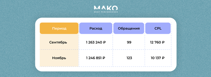 Оптимизировали рекламу по составной цели «Все конверсионные действия» ― объединили данные по всем пользователям, которые либо отправили заявку, либо достигли любой микроцели: кликнули по мессенджеру, по номеру телефона, адресу электронной почты.