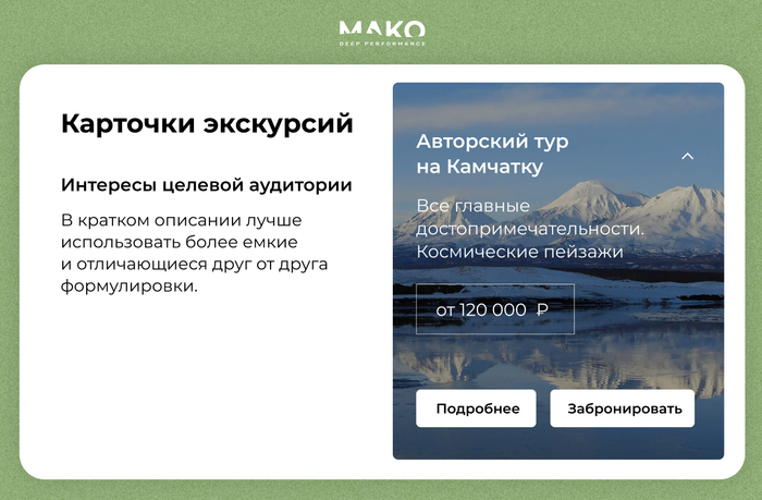 Продукт: индивидуальные экскурсиипо Алтаю и короткие туры по России ― от Териберки до Дагестана и Камчатки. Организаторы ― путешественники с 20-летним стажем ― разработали эксклюзивные программы для семей и дружеских компаний до 5 человек. Отдых для обеспеченной аудитории с комфортными условиями, поездками на джипах и вездеходах, погружением в местную жизнь и культуру. Проблема: мало продаж с сайта, отказность трафика более 50%.Мы провели анализ сайта и увидели, что на нем есть только базовая информация о программах. Непонятно, что в них входит, чем они отличаются друг от друга, преимущества описаны общими словами. Авторским турам приходится конкурировать с туристическими агрегаторами типа Трипстера или Яндекс Услуг и более бюджетными вариантами.