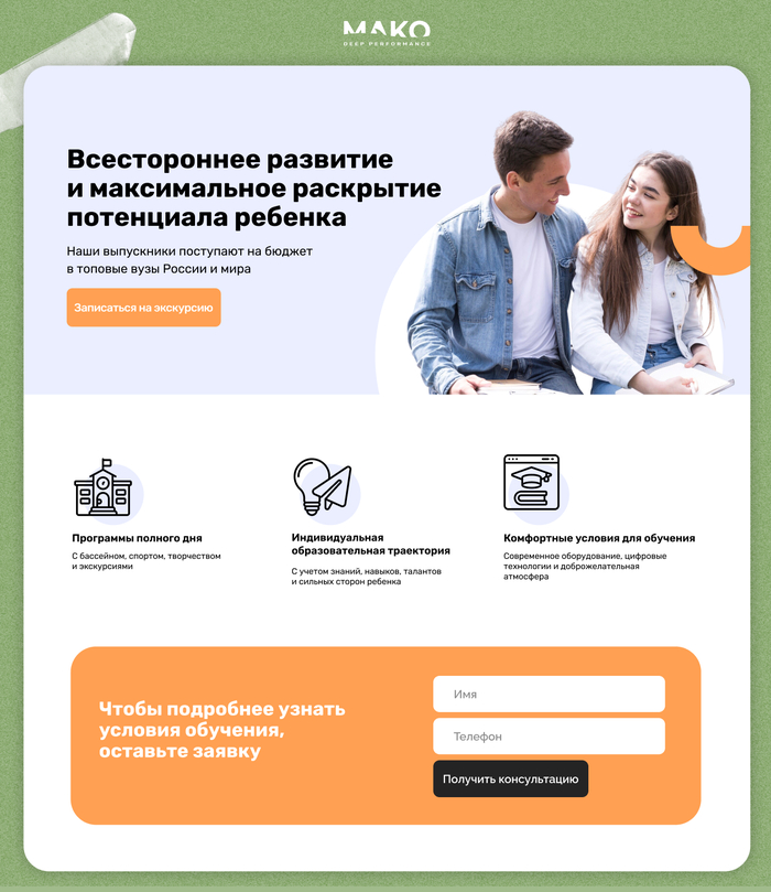 Полностью менятьосновной сайт было бы долго и технически сложно, к тому же школе нужен ресурс для информирования. Поэтому мы предложили сделать для рекламы отдельный небольшой сайт с главной и тремя посадочными страницами для каждого направления.