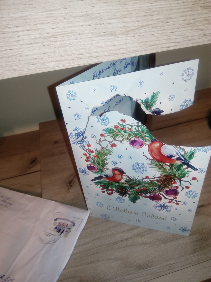 3. Финальное. Под Новый год мне прислали поздравительную открытку в почтовом конверте. Конверт пришёл растерзанным и переклеенным почтовым скотчем. Открытка пострадала! Интересно, что искали? Деньги? Или просто покоцали из вредности? Уточнила у отправителя, ничего не пропало. Я очень зла на Почту России!