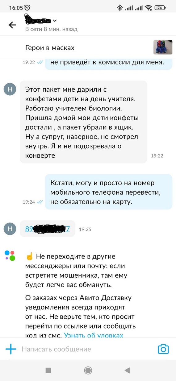 Она поверила мне и написала свой номер телефона. Авито меня предупреждает о возможном мошенничестве )