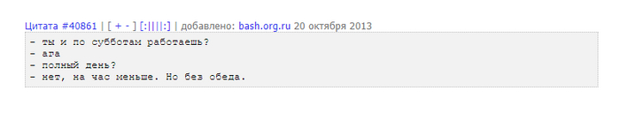 Ещё одно величайшее наебалово, которое многие не замечают – то, что у нас в стране якобы 8-часовой рабочий день. Ну да, в середине дня есть обеденный перерыв, в течении которого ты не работаешь и тебе за него не платят. Только вот всё равно ты в течении этого часа находишься либо на работе, либо рядом с работой. Существенной прибавкой к СВОЕМУ ЛИЧНОМУ времени этот час всё равно не является. И если тебе платят сразу за календарный месяц, а не за каждый час по отдельности, то главным вопросом будет не сколько там часов у тебя будут считаться рабочими, а во сколько ты освободишься и наконец-то сможешь поехать домой. Плюс по часу на дорогу туда и обратно – вообще по 11 часов в день получается. 8-часовой день, да…