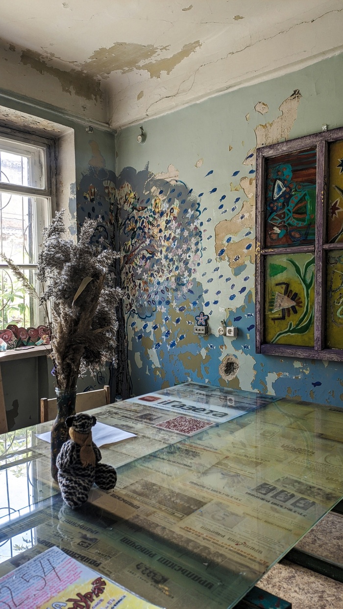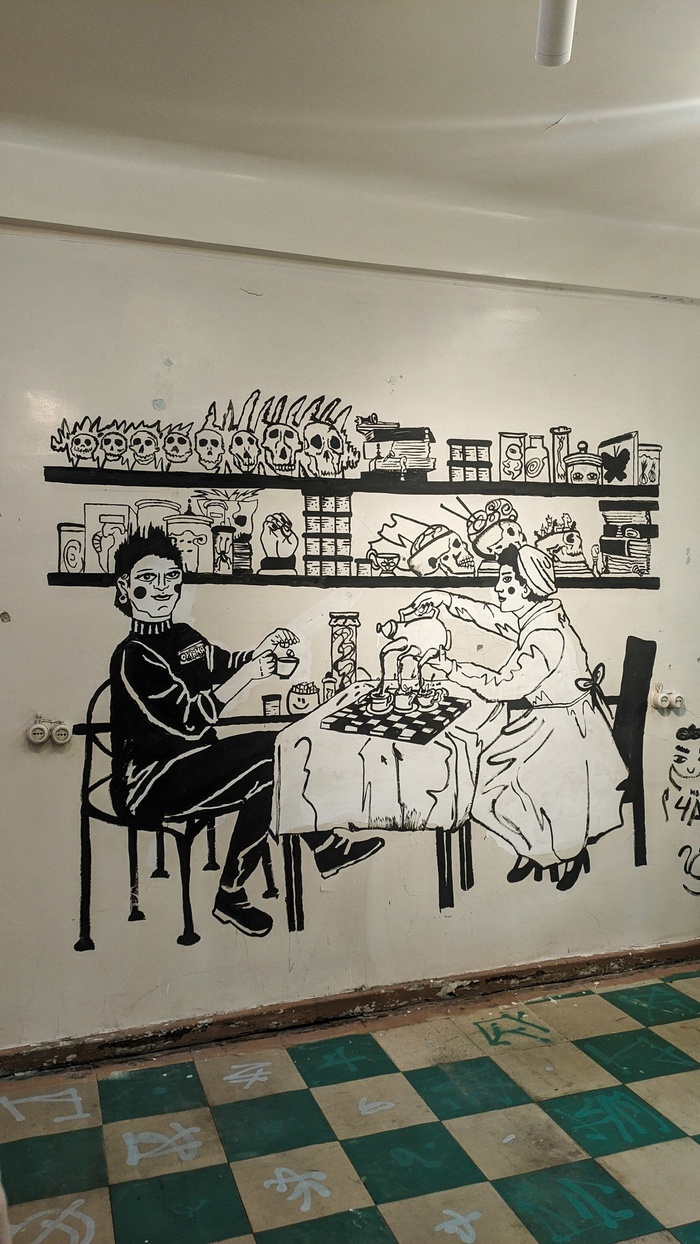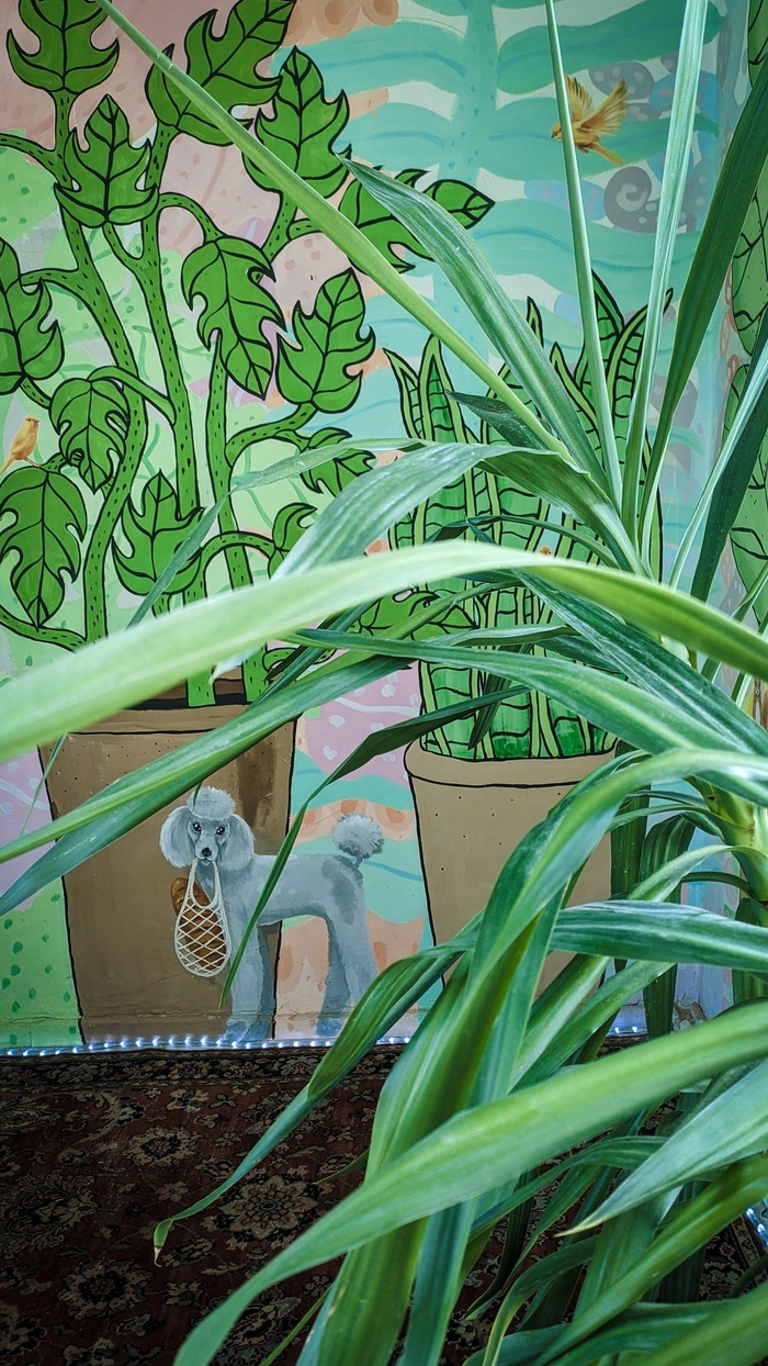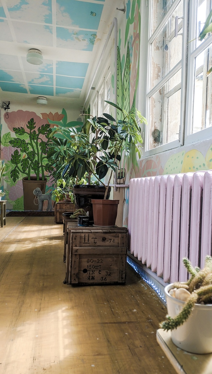 Одно из помещений бывшей больницы стало оранжерей. Художница https://vk.com/rita_haak вместе с командой других мастеров и помощников расписали комнату цветами. Главным притягательным центром комнаты является изображение пуделя с авоськой -э то отсылка к истории о том, что местная жительница обучила свою собачку самостоятельно ходить за покупками :)
