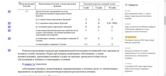 Итак, конкретно мой случай подразумевал, что у меня имеют место быть заболевания связанные с эндокринной системой, поэтому я открываю раздел 4 Расписания Болезней и вижу две таблички: "Статья 12" и "Статья 13". Статья 12 меня не интересует, так как никакого зоба у меня нет, а вот вторая табличка (по которой я кстати был комиссован ранее с категорией В) и является предметом моего поиска