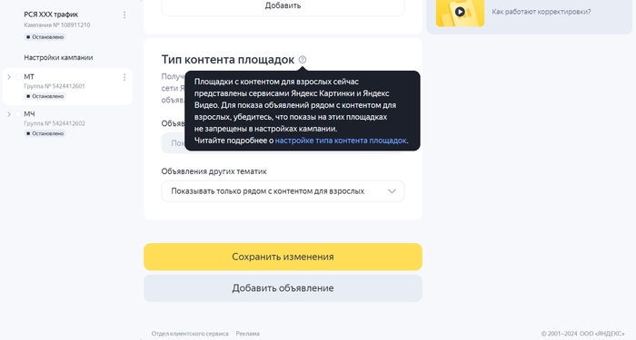 Показать рекламу пользователям площадок «для взрослых» можно с помощью Яндекс Директа. Создайте кампанию в РСЯ и в настройках на уровне группы объявлений выберите тип контента на площадках для показа рекламы — Показывать только рядом с контентом для взрослых.