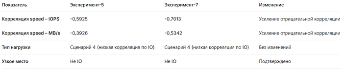 Отрицательная в обоих случаях, сильнее в эксперименте-7. Это подтверждает, что рост IOPS не ведёт к росту производительности, проблема в других подсистемах.