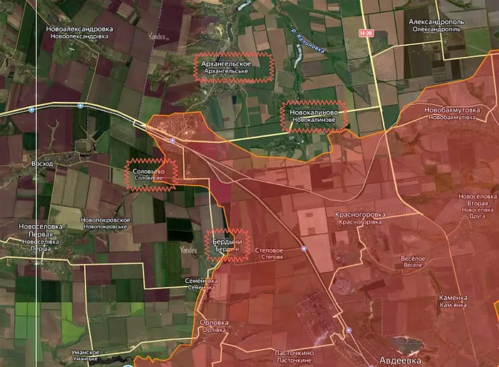На Авдеевском направлении, по сообщениям российских источников, враг оставил позиции в районе села Бердычи, входящего в так называемую вторую линию обороны ВСУ. Севернее наши бойцы водрузили российский триколор в поселке Соловьево и продвигаются на окраинах поселка Архангельское. В Новокалиново наши войска действуют на южной окраине.