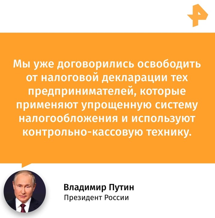 Добавлю, что мы уже договорились освободить от налоговых деклараций тех предпринимателей, которые применяют упрощённую систему налогообложения и используют контрольно-кассовую технику. Обращаю внимание коллег из Правительства и парламента: соответствующий законопроект принят в первом чтении ещё в прошлом году, но с тех пор работа над ним забуксовала. Прошу в ближайшее время довести его до конца.