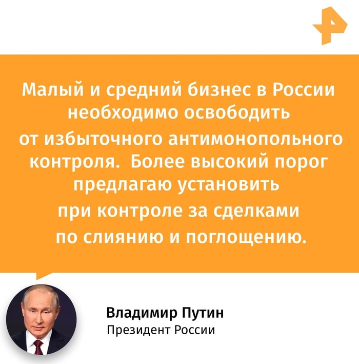 Например, антимонопольный контроль охватывает все предприятия с выручкой свыше 400 миллионов рублей в год. Предлагаю поднять эту планку вдвое – до 800 миллионов рублей, тем самым избавить большое число растущих компаний от обременительных, лишних отчётов и бумаг. И такой же более высокий порог предлагаю установить при контроле за сделками по слиянию и поглощению. То есть, если сумма сделки не превышает 800 миллионов рублей, её не надо будет согласовывать с антимонопольными органами.
