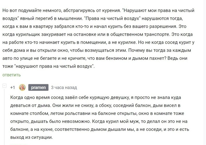 Ещё раз: когда курил мой муж на кухне - это была МОЯ проблема. Когда курит сожительница соседа - это должно быть проблемой СОСЕДА, а не моей. Не нравится табачный дым соседу на его кухне? Это не моя проблема, пусть решает её сам. Гоняй бабу на улицу, некоторые соседи из нашего подъезда выходят покурить на улицу. В моём случае сосед решил проблему радикально, просто выгнал бабу совсем, завёл себе некурящую. Ну это уже лирика, суть поста я изложила выше. Уважайте друг друга.