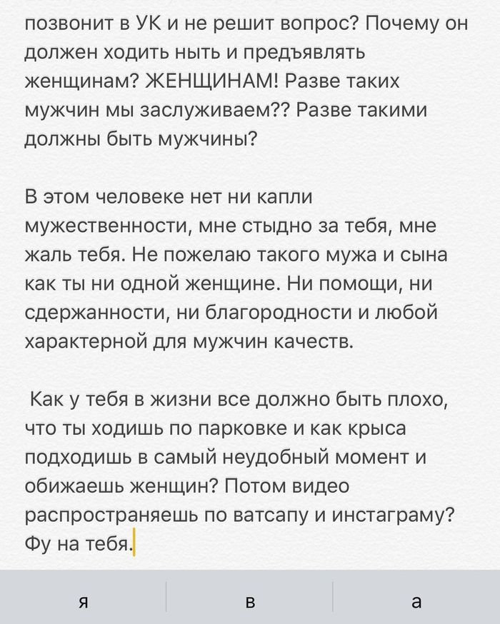 Как у тебя в жизни все должно быть плохо, что ты ходишь по парковке, подходишь в самый неудобный момент и обижаешь женщин? Потом видео распространяешь по ватсапу и инстаграму", - пишет Лина Малина.
