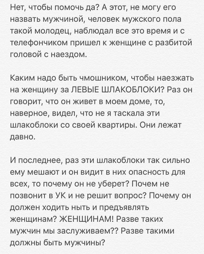 Каким надо быть человеком, чтобы наезжать на женщину за ЛЕВЫЕ ШЛАКОБЛОКИ? Раз он говорит, что живет в моем доме, то, наверное, видел, что не я таскала эти шлакоблоки со своей квартиры. Они лежат давно.