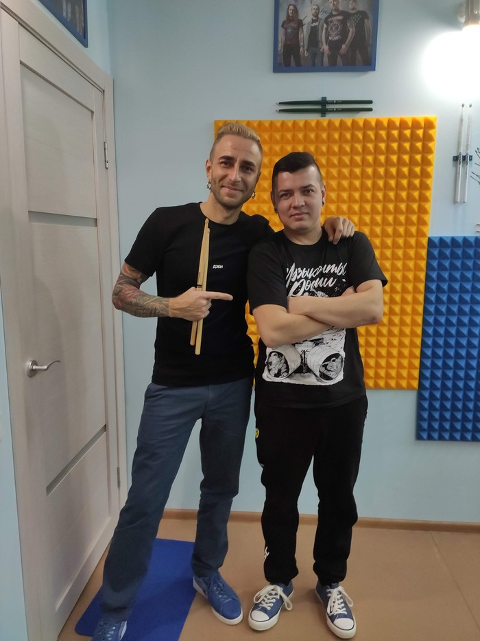 2021 год. Как обычно, начали ударно! Новые ученики прибывали, штат педагогов немного рос, оборудование постепенно заменялось на новое и более качественное. Было очень много звонивших лидов, желающих записаться на групповые занятия, но еще при открытии я создал несколько правил, которые соблюдаю до сих пор, одно из них: только индивидуальные занятия! Они, конечно же, не так выгодны, как групповые, но желание сделать качество, а не количество преобладало над искушениями, в конце концов, всех денег не заработать. Мы старательно готовились к очередному мастер-классу, на этот раз принимали иностранного гостя - Грэга Турини. У него был небольшой сольный тур по РФ в рамках рекламы фирм, производящих ударные инструменты, и в Казани проводить его мастер-класс выпала возможность нам. Грэг - барабанщик группы CHAOSEUM из Швейцарии. Там же у него своя школа. На тот момент он плохо говорил по-английски, поэтому срочно пришлось искать переводчика с французского. При встрече выяснилось, что он очень простой и открытый человек, который, в последствии, полюбил Россию всей душой, он даже наколол себе татуировку с Храмом Василия Блаженного. МК прошел лампово, ученики были восхищены его открытостью и большим желанием помогать в освоении материала. А я приобрел еще одного друга, с которым мы общаемся до сих пор. Он сильно ждет открытия границ, чтобы снова приехать к нам, и мы ждем и вспоминаем с теплотой.