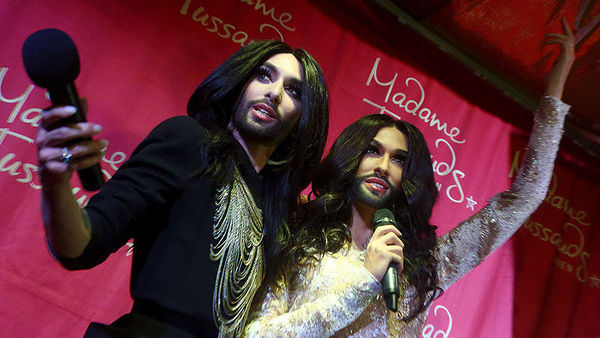 Кончита Вурст рядом со своей восковой фигурой в Музее мадам Тюссо в Вене, 2015 год