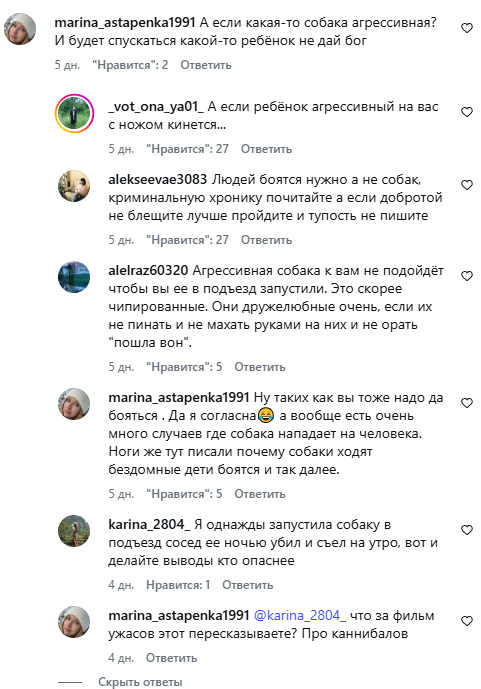У меня нет осуждения этих людей. У меня осуждение к системе. Системе, которая своевременно не определяет психиатрический диагноз этих людей. Да, я уверен (это моё субъективное мнение), что если подобным людям пройти психиатрическое обследование, то там явно будут отклонения. Кто-то может подумать: я слишком суров и не люблю животных. Я обожаю животных. Сколько себя помню, я всегда контактировал с животными. Сам я городской. Но при любом удобном случае (выходные/каникулы) летел в деревню. Там меня всегда радостно встречал пёс «Цыган». Полностью чёрный. Без единого белого пятнышка. Я его реально любил. В памяти он у меня ещё до школы. А умер он, когда я уже армию отслужил. В моей жизни всегда были животные. Попугаи, рыбки, хомяки, крыса была. Черепахи. И в данный момент - кошка. Но напомню. Деревенские условия жизни для меня не экзотика. А соответственно и уравновешенное отношение к животным. Что это значит? Определённый скот идёт на убой. Жалко, не жалко, но его и заводят и выращивают для этого. Кошка в деревне, это не для погладить. Это крыс, мышей гонять. Собака тоже выполняет определённые функции. От простой сигнализации, до спасения людей. Это моё мнение. И для меня, бродячие собаки не приемлемы. Для меня бродячие собаки, равно - дикие. А дикие животные не должны жить рядом с людьми. Хотел бы я узнать мнение зоозащитников, если бы по улицам города ходили волки, рыси и т.д. Хотя я изначально высказал претензии к системе, но я понимаю, что выявлять психические заболевания у населения на данный момент, практически невыполнимая задача. Просто ресурсов не хватит. Количество психиатрических расстройств год от года растёт, а значит зоошиз будет всё больше и больше. Но психиатрическое расстройство - это не безумие. Поэтому считаю, что Кодекс Российской Федерации об административных правонарушениях и уголовный кодекс РФ, вполне способен «вылечить» подобные психиатрические отклонения. Здесь главное, необратимость наказания.