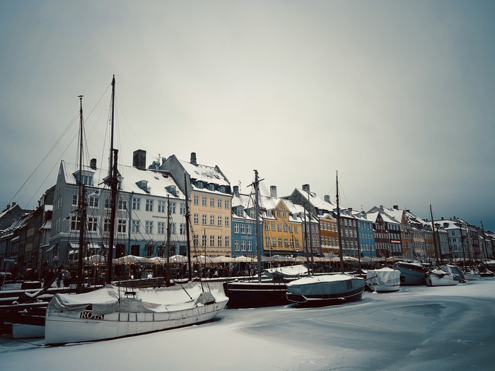 Дошла до тех самых цветных домов. Снизу кафешки, но снаружи никого, холодно. Место называется Нюхавн. Чуть обработала фото для настроения