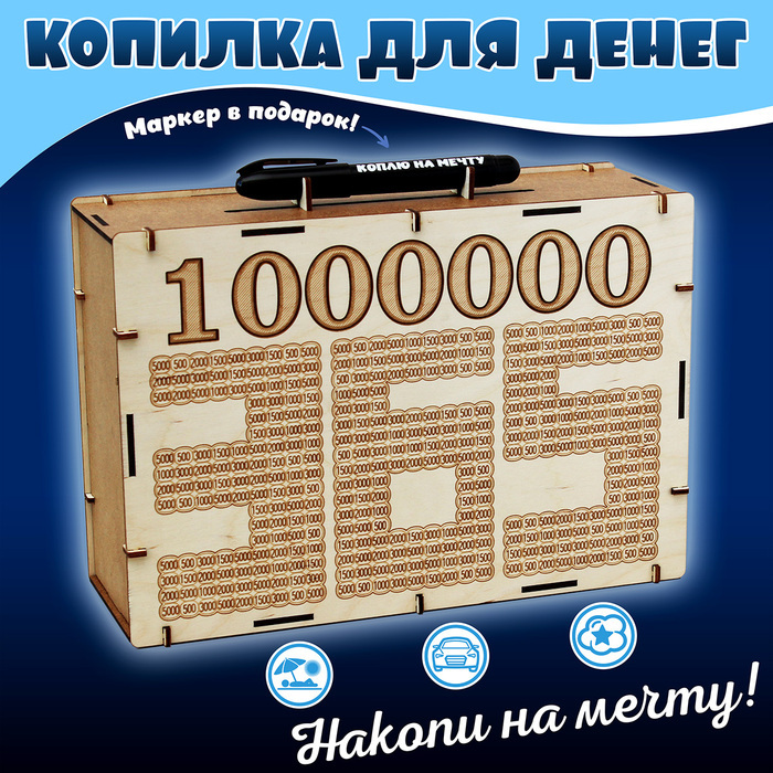 Эта копилка для денег — не просто коробка, а настоящий финансовый помощник! Ее секрет в 365 числах с суммами, которые нужно ежедневно класть внутрь и зачеркивать маркером из комплекта. Через год вы накопите 100.000 рублей — и это не магия, а продуманная система! Суммы каждый день можно выбирать разные, и 50 рублей, и 100, и покрупнее - до 1000 руб.