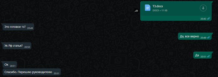 Я пишу Николаю в ТГ - не прочитано. Пишу в ватсапп, прикладывая скрин переписки с Егором - не прочитано. Отправляю смс. Реакции никакой. Через сутки звоню. Трубку берет очень милый Николай и говорит, "да-да, в курсе, все переведем", я спрашиваю, когда конкретно, на что Николай отвечает: " а у вас что, большая сумма?". Тут я немного зависла, думая, как размер суммы зависит от скорости оплаты, но ответила, что сумма небольшая, да только жду я ее третью неделю. Николай задает мне гениальный вопрос: "А почему так долго?", а в конце разговора говорит, что сегодня-завтра переведет.