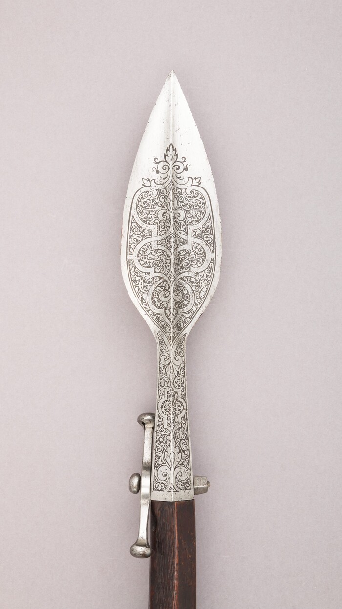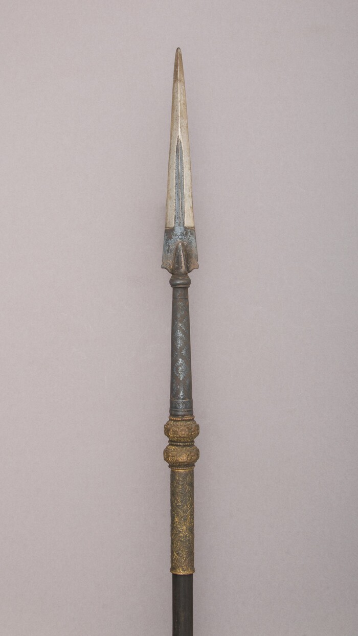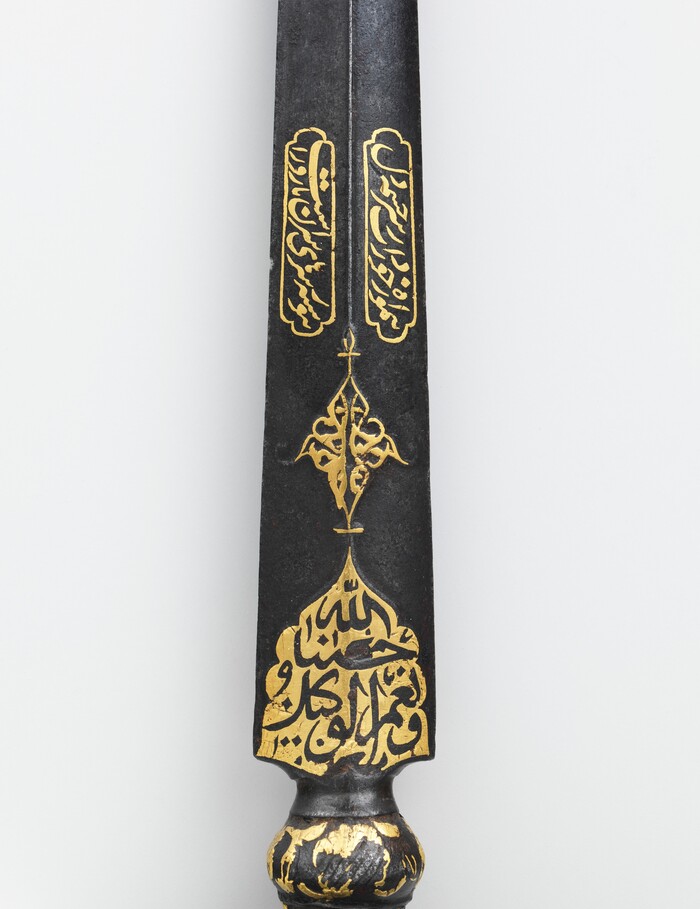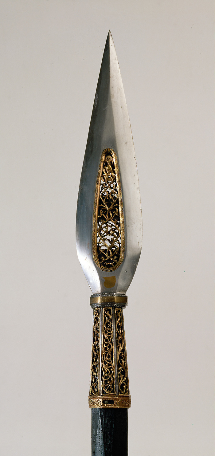 Наконечник копья, 1593–1594, Иран. Материал: сталь, золото. Длина 38,1 см. Наконечники этого типа использовались на кавалерийских копьях. Персидская надпись: "Оно постоянно пьет воду из источника сердца".