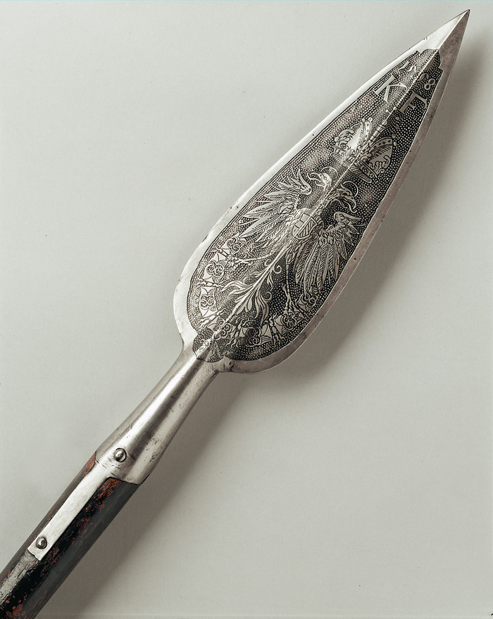 Охотничье копье Августа I Сильного, курфюрста Саксонии, короля Польши, 1700 год. Частично позолоченная сталь, дуб, кожа, латунь, кость. Размеры наконечника 42,5 x 7 x 4,4 см.