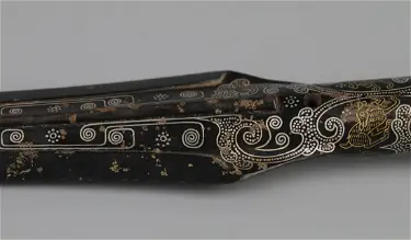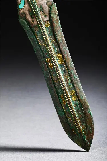 Наконечник копья, Китай, период воюющих царств, изготовлен из бронзы, золотая, серебряная и бирюзовая инкрустация. Длина 19 см. Вес 197 г.