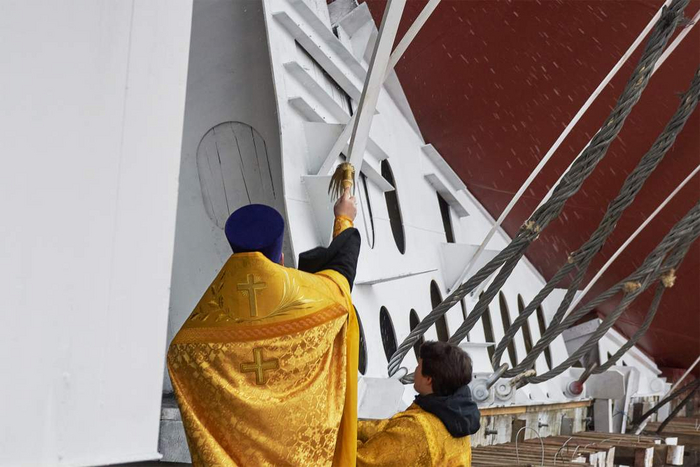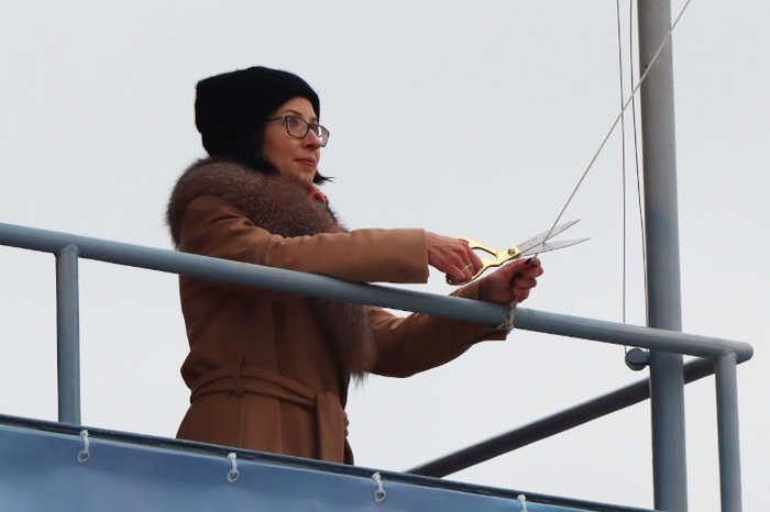 По морской традиции корабль освятили, после чего бутылку шампанского о его борт разбила «крестная мать», которой стала директор Департамента по управлению персоналом ОСК Юлия Оганезова.