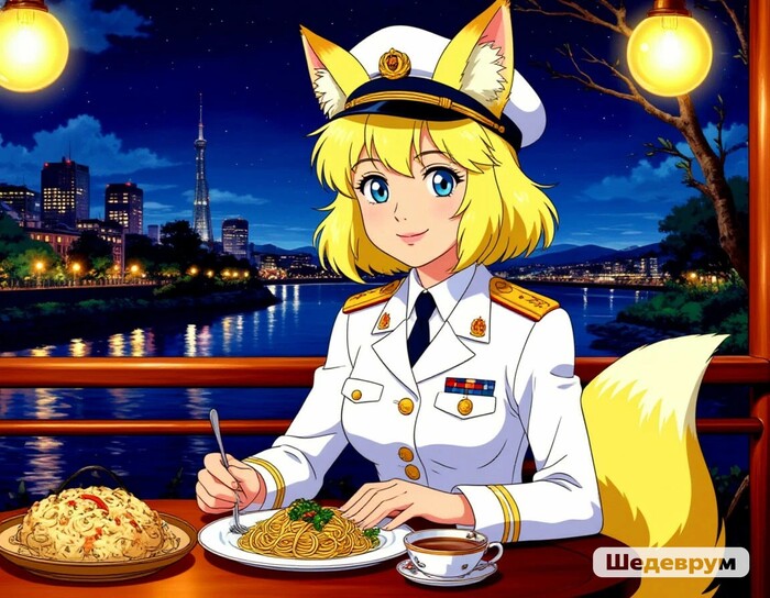 Игорь: -О, смотрите, это же капитан корабля там ужинает! Я её на капитанском мостике видел! Видимо она решила поесть и отдохнуть во время стоянки теплохода