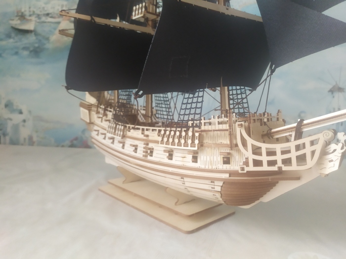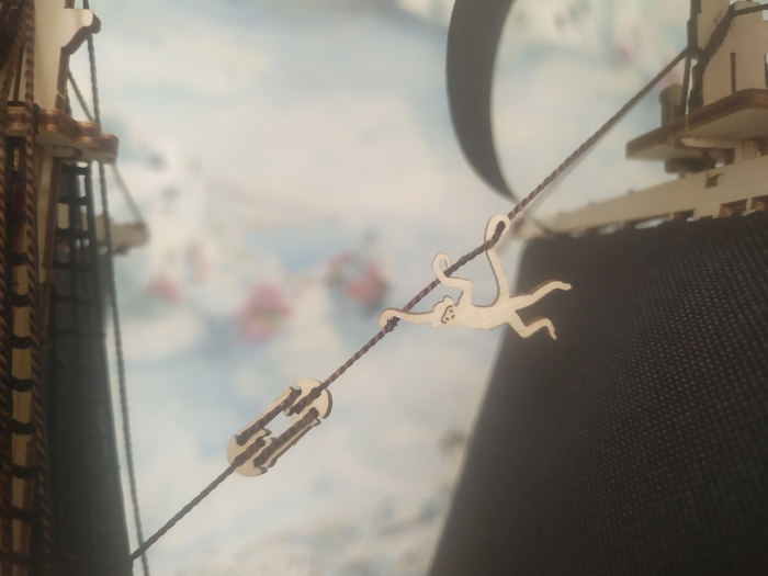 Ванты выполнены единым блоком, вязать не нужно, и ставятся в специальные посадочные места. И крепятся блоками, имитирующими юфесы. Так же устанавливаются паруса.