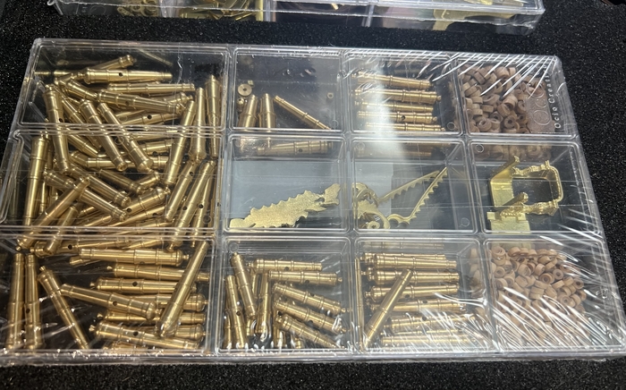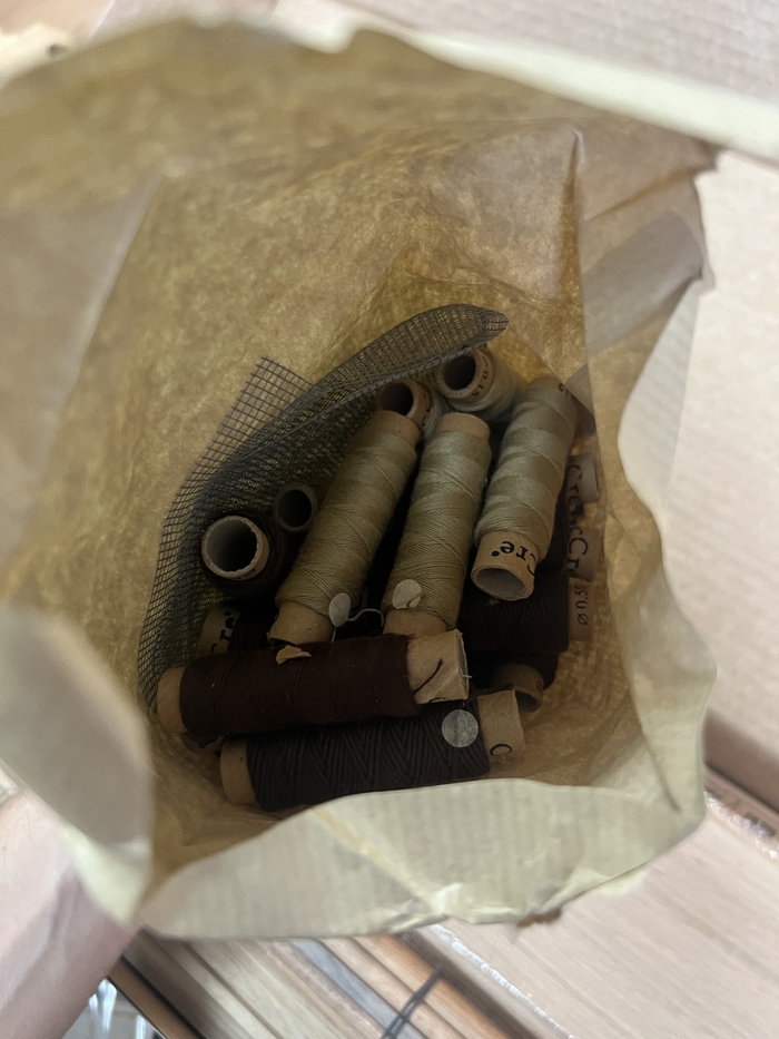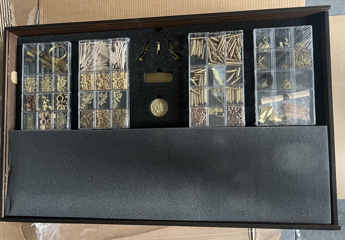 Две коробки с рейками, деревянными деталями, парусами и нитями для такелажа, нитей очень много.