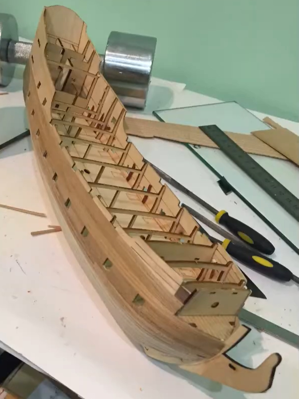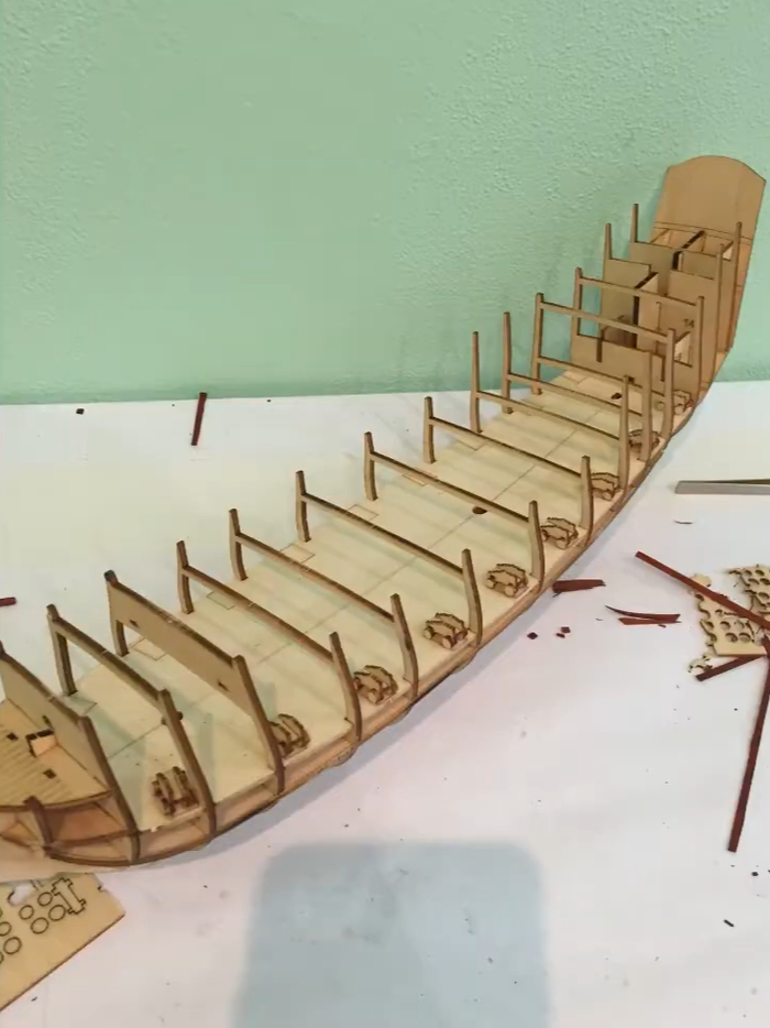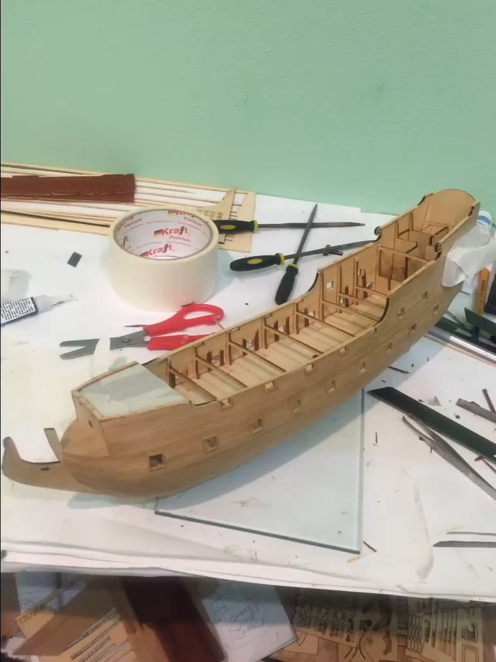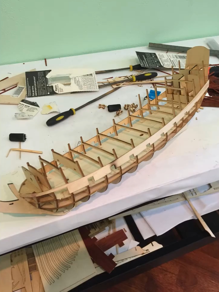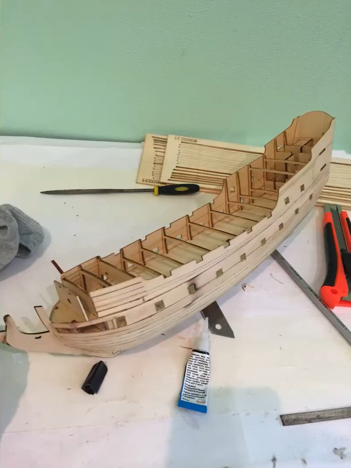 Тоже как-то собирал модель. Вдохновился рекламой диагостини, но посчитав во сколько выльется весь корабль пошёл штудировать интернет. Нашёл что-то около 6-7 тыщ за весь набор. Было это году в 2010. В наборе куча разной древисины, которую надо отпиливать и обрабатывать под свои размеры по инструкции. На фотографии с мелочевкой только железные детали уже готовые и валы, остальное самостоятельно руками. Если интересно - задавайте вопросы, может подскажу каким советом при сборке подобных. Может и все этапы выложу от скелета до парусов.