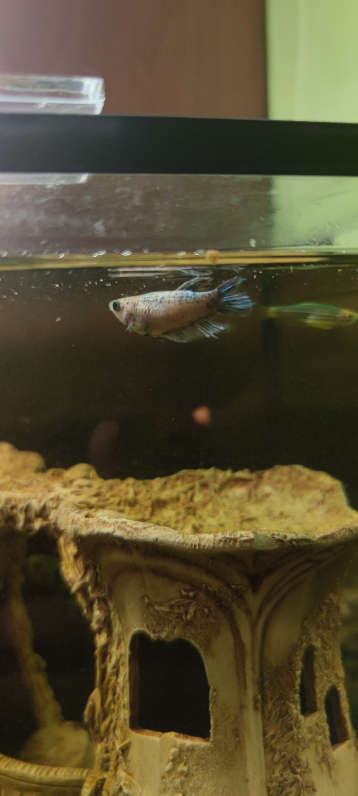 Отдельной историей стала проблема улиток. Мы купили роголистник, потому как хотели живые водоросли, а других на момент покупки в зоомагазине не нашлось. И вот на нем к нам прибыли катушечные улитки. Ошибкой было класть водоросли и не убрать улиток, но на ошибках учатся. Мне пришлось через ситечко для чая прогонять весь грунт, чтобы убрать всех улиток, промывать декорации и на пару недель улитки действительно исчезли. Незадолго до приезда аквариума побольше эти самые улитки снова появились. Где они прятались две недели не ясно, скорее всего в замке. Роголистник, кстати, достаточно быстро погиб, как выяснилось, ему очень плохо от синьки, которую мы использовали первое время при подмене воды.