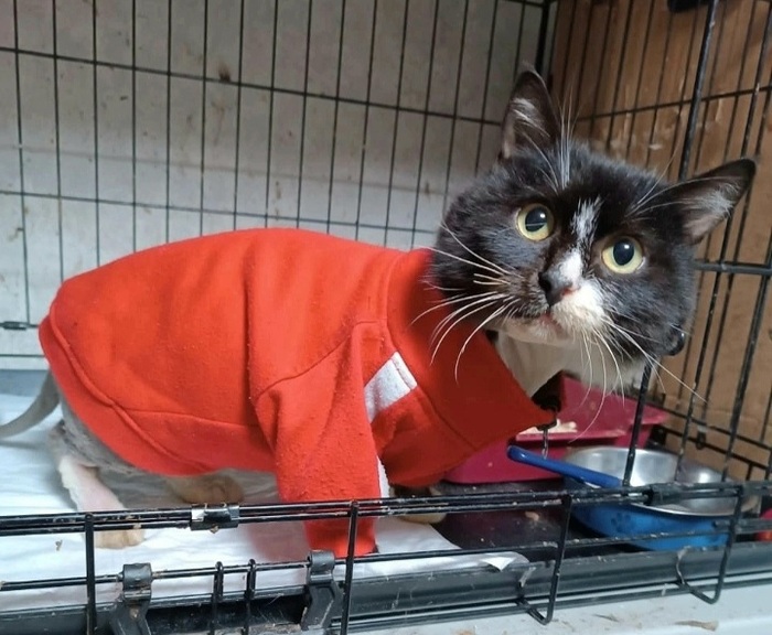 А всё потому, что его язычок не может слизывать пищу , потому что с одной стороны языка повреждён нерв . Вылизываться у него тоже не получается, поэтому одежда спасает от чрезмерного пачканья шерсти во время еды.