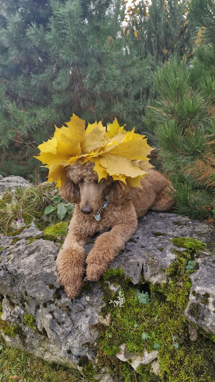 Наконец то я кривыми ручками смогла сплести венок из кленовых листьев. Дети утром дрыхнут, поэтому фотосессия с собакой❤️