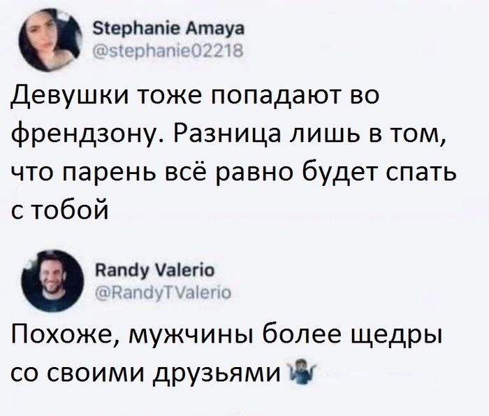 Общался с одной, как оказалось, френдзоньщицей. Вела себя, как будто "все взаимно, но не так быстро, и надо сначала поухаживать". Однажды пишет, просит зимнюю резину спустить с балкона с этажа в машину. Я говорю, легко, но за тарелку супа. Она согласилась, но с условием, что вынесет мне тарелку супа в подъезд на площадку)))