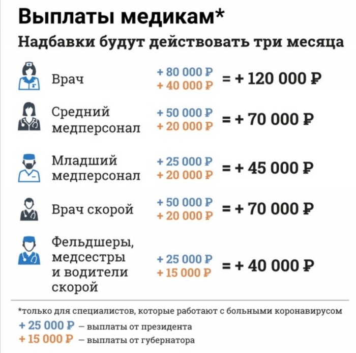* Врачи скорой, контактирующие с заболевшими пациентами, получат 50 тысяч рублей от президента и 20 от губернатора — итого 70 тысяч рублей.