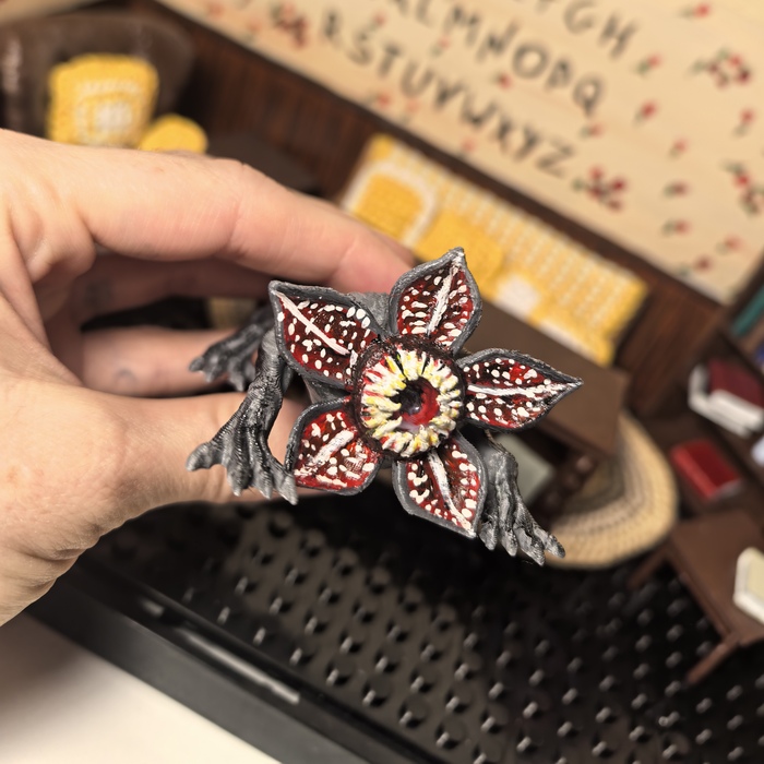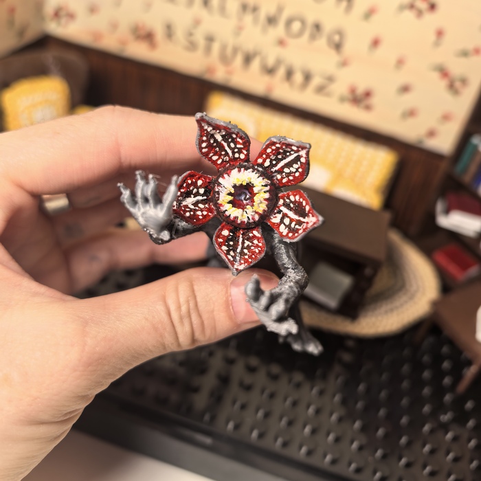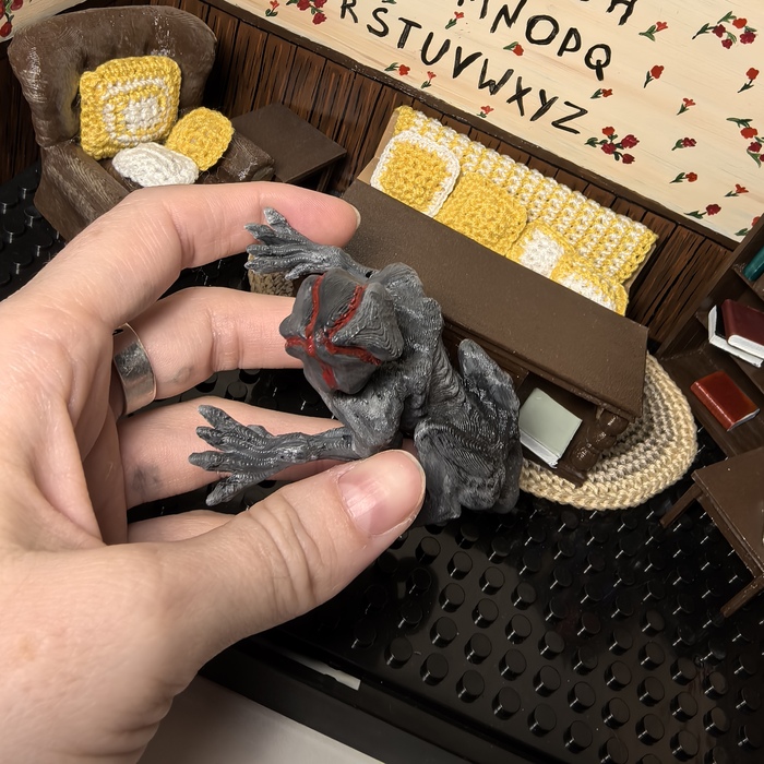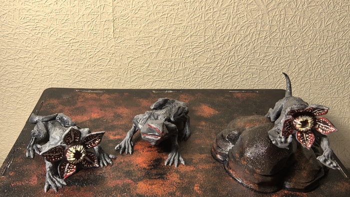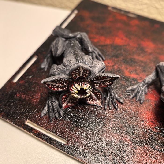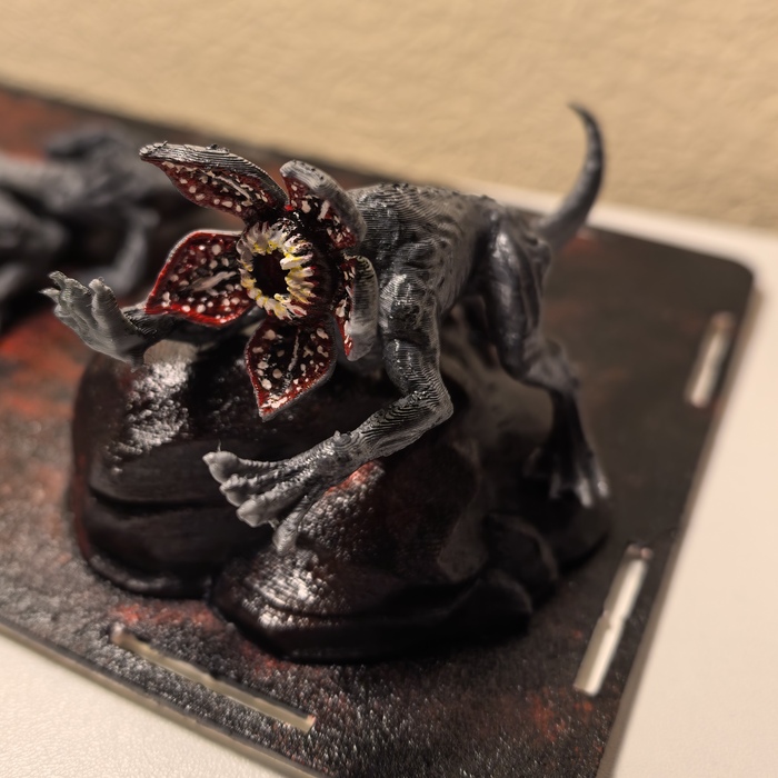С последним из троицы пришлось повозиться и отступить от первоначального плана. Демогоргон замер в позе прыжка, явно приготовившись к атаке. Приклеить его в такой позе оказалось крайне сложно, ибо его большая головушка смещала центр тяжести. Поэтому дополнительно распечатан большой валун, ставший опорой для демогоргона.