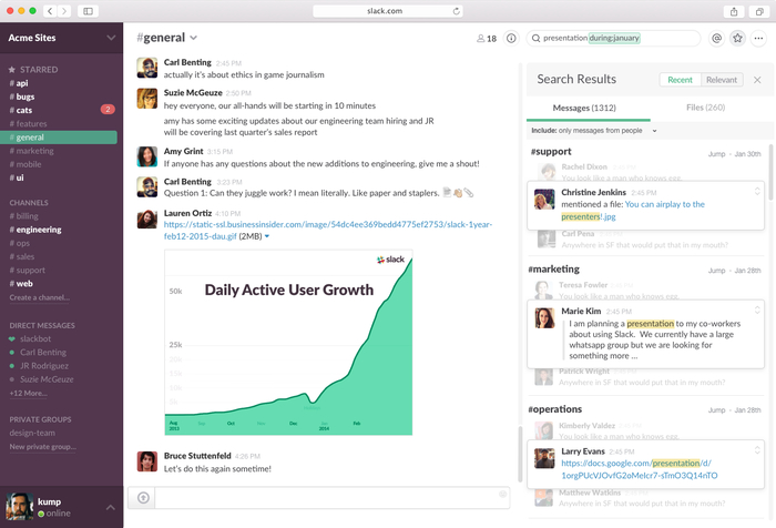 Коммуникация строится вокруг рабочих пространств и каналов с поддержкой тредов, личных и групповых сообщений.
