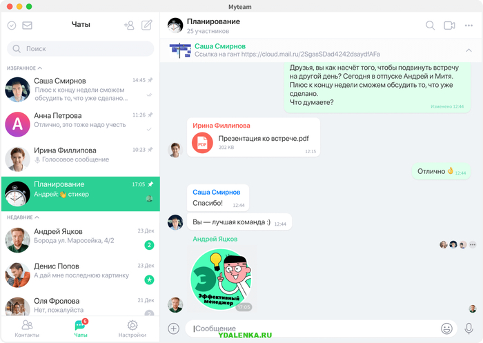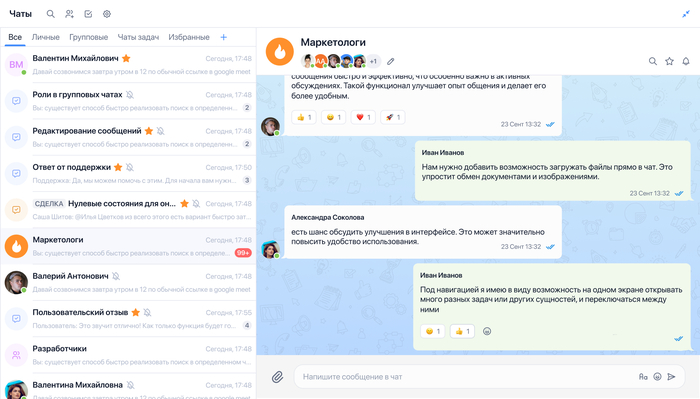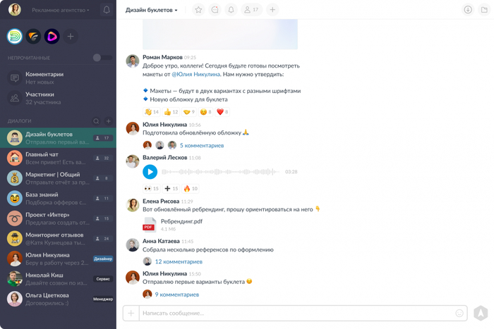 Коммуникация строится вокруг рабочих пространств с папками и закреплёнными чатами — по проектам, отделам и клиентам.
