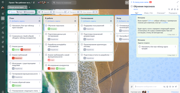 Затем сделали простую вещь: закрепили за каждой задачей свой чат — он появляется вместе с карточкой на доске. В нём можно обсуждать правки и принимать решения.