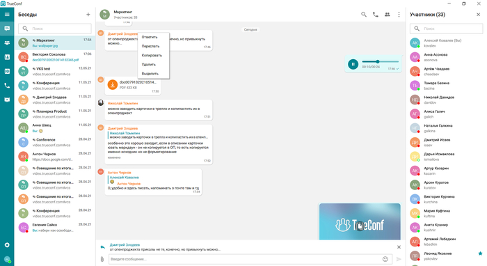 Мессенджер поддерживает реакции, обмен файлами, реплаи, голосовые сообщения с расшифровкой, опросы и скринкасты. В веб-версии доступен полноэкранный режим со списком всех чатов и отдельной вкладкой с файлами.