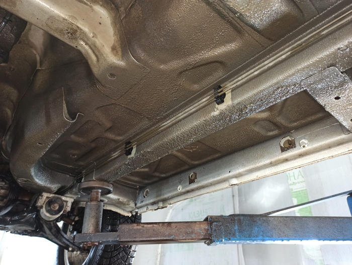 Перед нанесением битумных составов днище автомобиля нужно как следует подготовить. Для этого машину надо загнать на подъемник и тщательно вымыть. Затем снять весь защитный пластик, если он есть, включая подкрылки, моторную защиту, накладки на пороги – словом все то, что затрудняет доступ к днищу. После этого нужно провести мойку под давлением с применением специальных шампуней, отдельное внимание уделив скрытым полостям.