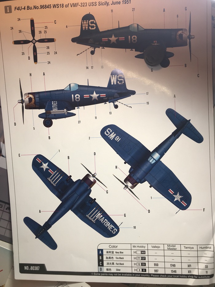 О наборе: Набор 2008 года от японской фирмы Hasegawa, обновление классического набора, состоящего из пластика 1981 года и декалей 1988-го. В фирменной длинной некрупной коробке лежат три литника из серого полистирола, литник из прозрачного с фонарём кабины, декаль и инструкция. На фото выше можно видеть фигурку пилота от Airfix и мини-подставку от Modelservice, они в набор не входят. В наборе всего 36 деталей, но не нужно спешить с выводами. Во-первых, будут использованы все детали без остатка. А во-вторых, Хасегаве удалось в минимальном количестве деталей передать много подробностей. Качество литья выше среднего, пара кусочков облоя толщиной в волос и некоторая несостыковка половин пресс-формы погоды не делают, но есть и более грубый дефект: следы толкателей на внутренних сторонах створок ниш шасси. Пластик хороший, довольно твёрдый, если бы нужно было много пилить, раздражало бы. Но пилить-то как раз не надо. Прозрачная деталь на высоком уровне - тонкая, чистая, идеально становится на место, имеет тонкий и удобный в работе переплёт. Детализация выше среднего: хорошо показаны элементы шасси и их ниш, маслорадиаторы в крыльях выполнены отдельными деталями, вполне достаточно проработаны двигатель и пропеллер. Интерьер кабины упрощён, но выглядит весьма неплохо. Расшивка смешанного типа - щели механизации крыла и рулей, стыки в месте излома крыла даны впадинами, остальные элементы - выступами. Я не впервые работаю с такой расшивкой и не считаю её недостатком. Конечно, она упрощена, но смотрится на готовой модели неплохо. Стыкуемость, типично для Хасегавы, отличная. Набор не имеет вариативности по сборке, нельзя даже открыть фонарь, или убрать шасси, или выбрать подвесное вооружение. Фигур, стоек или прочих бонусов в наборе нет, но мне пригодились декали названия истребителя и логотип производителя. Инструкция - типичная для Хасегавы, удобная и наглядная, есть минимальная информация о прототипе. Схемы окраски трёхцветные (чёрно-сине-белые), самолёт показан со всех ракурсов. Предлагаются два варианта: Корпуса Морской пехоты из эскадрильи "Шахматная доска" и ВМФ с борта не помню какого авианосца. Оба варианта монотонные синие, разве что флотский вариант имеет жёлтый перед капота. Декаль вполне хороша в работе, довольно тонкая и не прозрачная. Из технички есть только надписи на лопастях винта. В моём наборе белые декали приобрели оттенок слоновой кости (очевидно, от длительного хранения), что не испортило вида готовой модели. Касательно цены - я покупал набор давно, пару лет назад, и он был недорогим. Не копейки, конечно, но и не много. Сейчас он явно подорожал, но я всё равно смело могу рекомендовать его моделистам любого уровня. Лично я получил массу удовольствий от работы с ним!