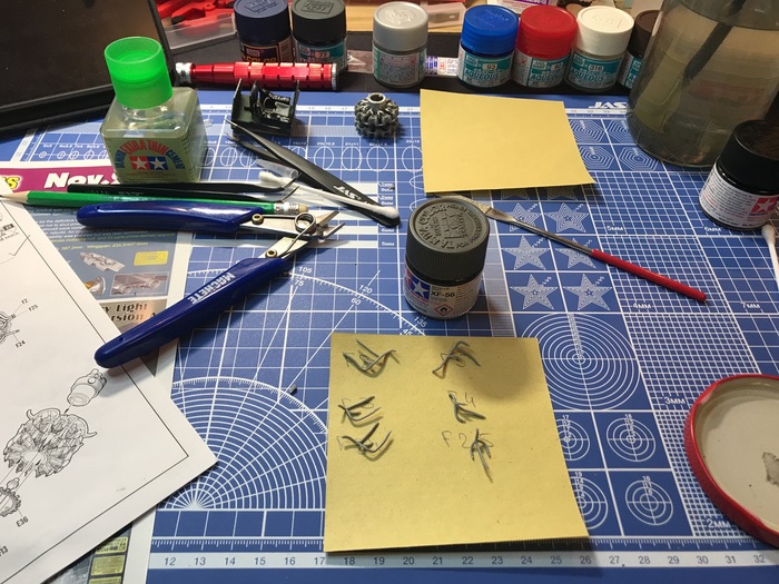 Помимо красок я стал обладателем кусачек-бокорезов, цангового ножа, трёх кисточек, сверхтекучего и обычного клея, пары поролоновых шлифовальных губок, прямого и изогнутого пинцета, восьми зажимов (я их купил больше по фану, но потом оказалось, что это очень полезные штуки) и, конечно же, красивого синего мата формата А3. В тот момент мне казалось, что всего этого более чем достаточно, чтобы собрать нормальную модель. В действительности это оказалось не совсем верно. Но буду рассказывать по порядку.