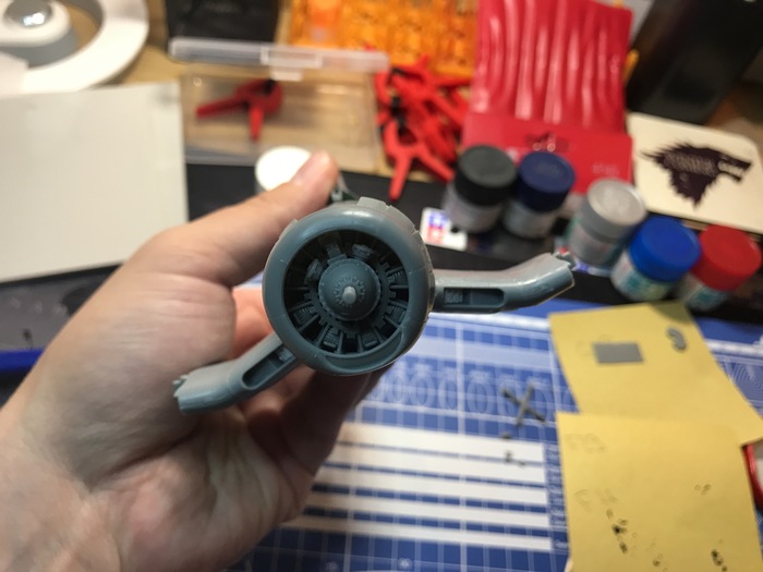 Следующим этапом был двигатель. Его тоже стоило сначала покрасить, а потом клеить, но я этого не сделал, потому что опять же, этого не было в инструкции. Там было только то, что надо покрасить патрубки. Это я сделал. Патрубки представляли собой кривые закорючки, которые, чтобы не запутаться, я клал на листик с номерами на литнике.