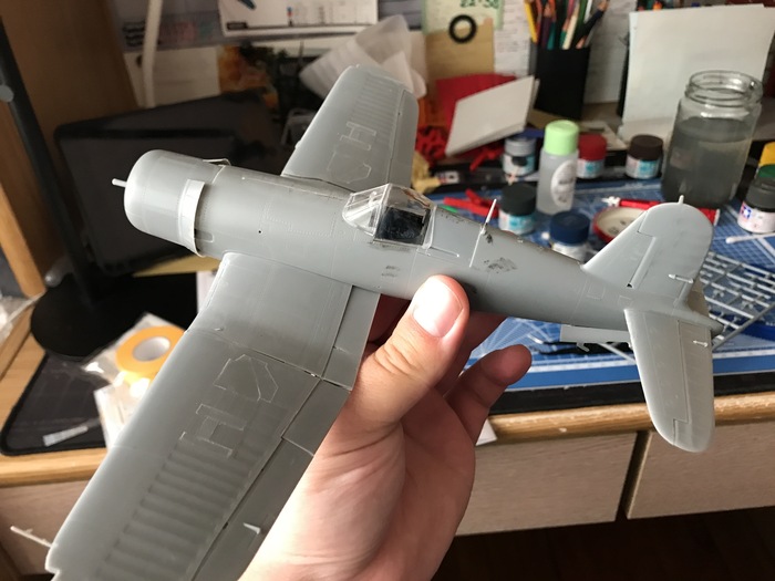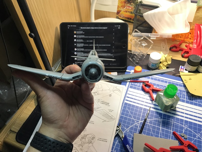 После этого уже можно было приделать фонарь остекления кабины и крылья. Модель становилась похожей на самолёт. Попутно фоном включил видео на YouTube с документалками об этом самолёте. Кроме тягомотины, сколько на каком заводе построили машин, мне запомнилась одна занятная деталь. Оказывается инженеры, в погоне за мощностью, запихали туда длиннющий двигатель, но обратной стороной медали было то, что лётчику было вообще ничего не видно, когда он заходил на посадку (кабина же за двигателем расположена). Поэтому на предпосадочный прямой на авианосец они шли со скольжением, чтобы из-за длиннющего капота было вообще что-нибудь видно.