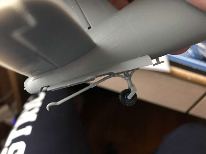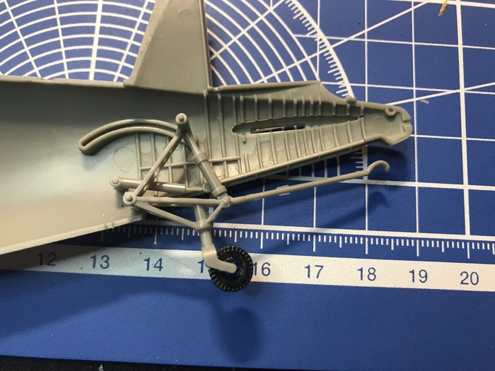 Далее началась сборка фюзеляжа. Я начал с того, что собрал заднюю опору шасси вместе с гаком (крюком, которым палубные истребители цепляются за аэрофинишёр при посадке на палубу авианосца). Её тоже следовало окрасить заранее, чего я не сделал, а потом исправлял, пытаясь пролезть кисточкой в труднодоступные места. Без проблем не обошлось и здесь. Сколько я ни старался, у меня не получалось сделать гак как на картинке, чтобы он был опущен на 30-40 градусов. Вместо этого он задирался почти параллельно фюзеляжу. Я плюнул и решил отложить решение этой проблемы на потом. Естественно потом я ничего не смог исправить и в итоге оставил всё как есть.